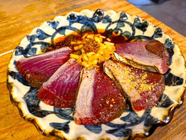 夏カツオのたたき黄ニラだれ 858円 これはおいしい。健康的でお酒もご飯もススム系の酒の肴です。