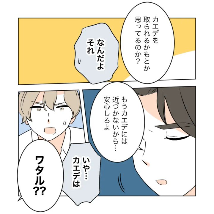 「シズクと付き合ってんの?」カエデと毎日帰宅するようになり、カエデの家にもいたショウマに聞かれて、ワタルはムッとしました。ショウマは、カエデの妹サクラと付き合っているのだとハッキリ言いたいのですが、サクラに口止めされているので言えません。「もうカエデには近づかないから・・・安心しろよ」とワタルが言ったので、ショウマはカエデの気持ちを伝えようと「いや、カエデは・・・」言いかけたところで「ワタル?」と遮って入ってきた女子の声が。