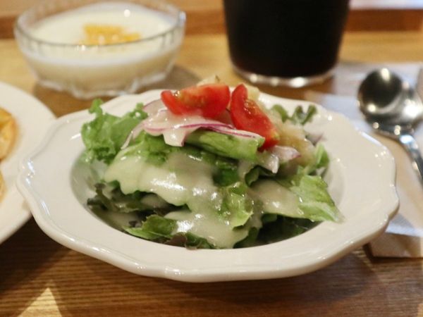 サイドのミニサラダには自家製玉ねぎ&リンゴのドレッシング、北海道興部(おこっぺ)町直送のヨーグルトにはオレンジの果肉がトッピング。ひとつずつ丁寧な内容が嬉しいです。