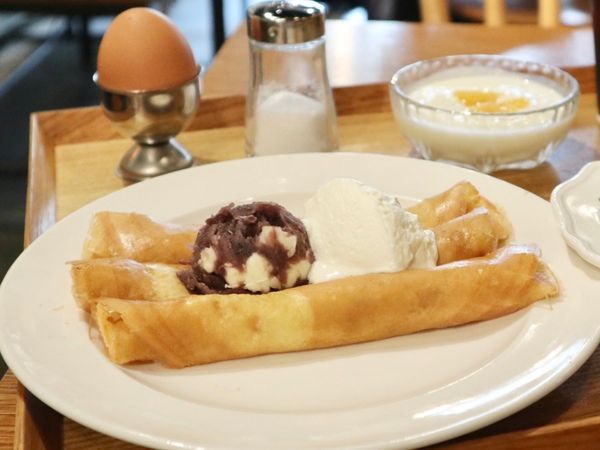 綺麗に一枚ずつ巻かれたクレープにはぽってり粒あんや生クリームがデコレート。