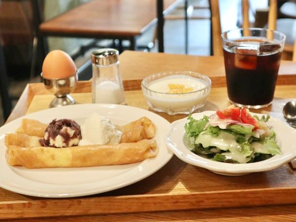 あんバタースコーンサンドもしくはあんバタークレープ、サラダ、ヨーグルト、ゆで卵、コーヒー(ホットもしくはアイス)を880円で楽しむことができます。