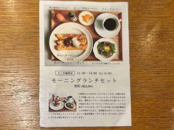 お食事からスイーツ、お酒まで幅広いメニューが魅力的な「日晴堂」。今回、お目当ての「モーニングランチセット」は月曜から木曜の11時から14時限定のメニューです。