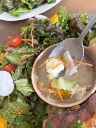 スープはとっても優しいお味で美味しい。カリフラワー大好き。