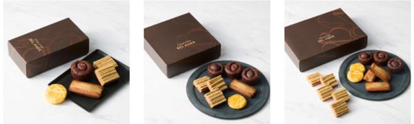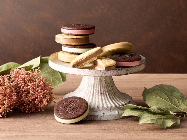 香ばしく焼き上げたサブレで、豊かな味わいのショコラを贅沢にサンド。サクッとした食感とショコラのなめらかな口どけが絶妙に調和します。チョコは硬すぎず柔らかすぎず、サブレとのバランスを追求した商品。味はビター、ルビー、ノワゼット、キャラメル、ブランの5種。単品販売はビター、キャラメル、ブランの3種です。1個 389円。