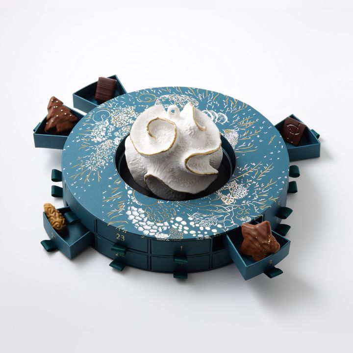 2025年のアドベントカレンダーは、海洋世界に住む生物や珊瑚、そして海できらめく泡などが描かれていて、深海にいるような幻想的で魅惑的な円形型のボックス。ショコラやサブレ、パンデピスなどが引き出しに。