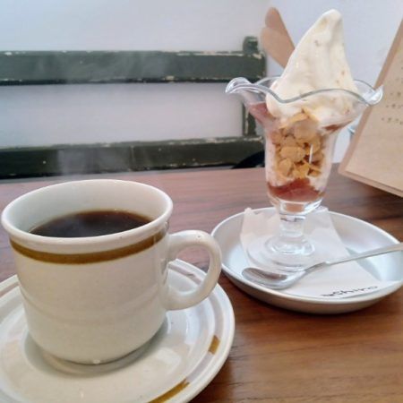 サイフォンで淹れた薫り高いコーヒーをひとくち。やはりTAKANO COFFEEさんの豆はおいしいです。サイフォンで淹れられた熱めのコーヒー(写真で湯気がわかるでしょうか?)とソフトクリームの冷たさを交互に味わうひととき。リラックスタイムになりました。