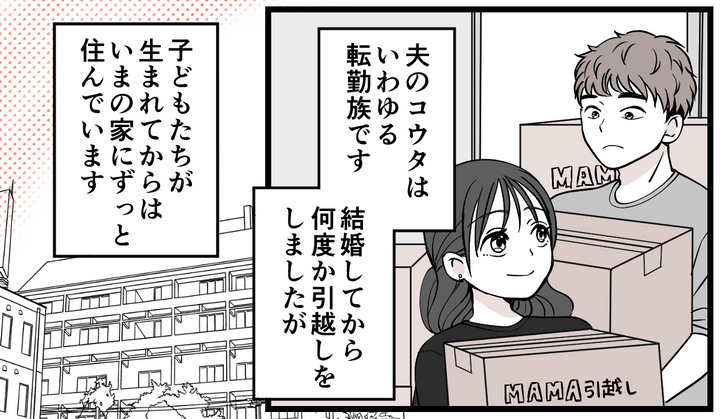 私はマオ。夫のコウタと結婚して10年くらいになります。2人の子どもにも恵まれ、小学生の娘カリン、幼稚園に通うハヤテと4人で暮らしています。コウタは元々転勤族で、子どもが生まれる前には私も転勤に付き合って何度か引っ越しをしました。しかし子どもが生まれてからは、会社もある程度考慮してくれているのか転勤の話が持ち上がることもありませんでした。このまま静かに暮らしていたい……と願っていた矢先、コウタからある話を聞かされました。