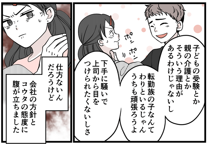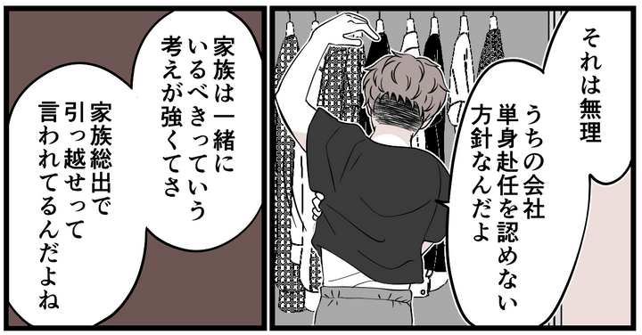 会社として「家族は一緒にいるべき」という考えが強いのだとか……。よっぽどの事情がない限り、単身赴任は受け入れてもらえないとコウタは言います。今まで単身赴任をOKされた社員はほとんどいないらしく、家族総出で引っ越すのが会社のルールだと念を押してきました。