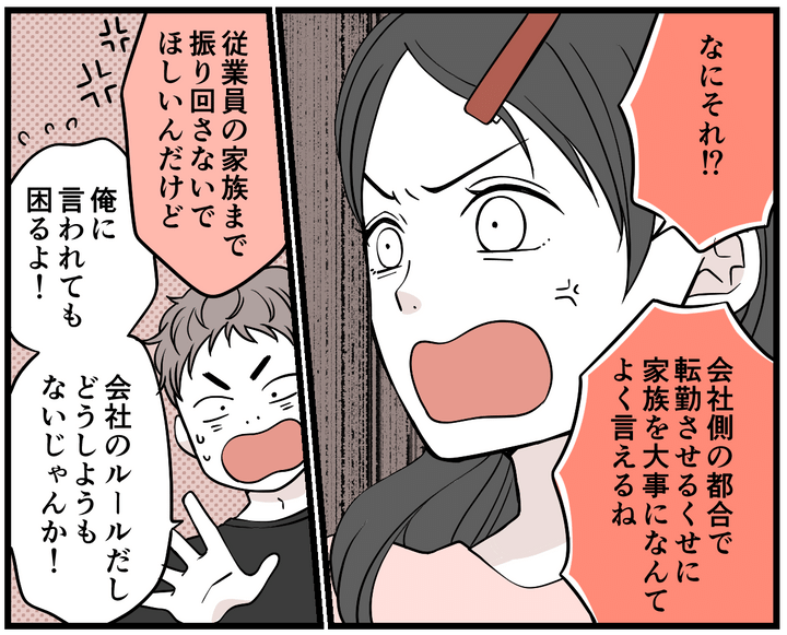 会社の都合ばかりで、私たちの生活をまったく考えていないじゃありませんか。コウタの会社に逆らいたくない気持ちもわかりますが、私たち家族のことはどうなるのでしょう。会社のルールだから仕方ないって、そんなのあんまりです……!