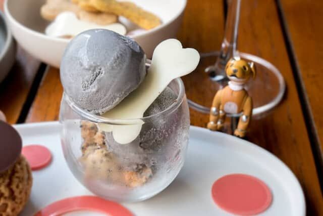 ▲ホワイトチョコレートの “骨” が飾られた「黒ごまのアイスクリーム」
