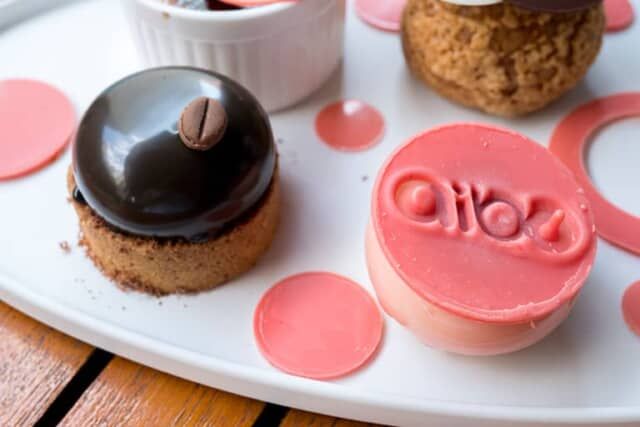 竹炭のブラックチョコレートでムースをコーティングした「エスプレッソクリームとナッツのタルト」は2023年の “エスプレッソ” がモデル。キャラメルナッツの風味が広がるタルト生地も印象的。aiboのロゴが刻まれた「ミルクムース」はふわりと柔らか。イチゴのジュレやジャムが入る優しい風味が口の中に広がります。