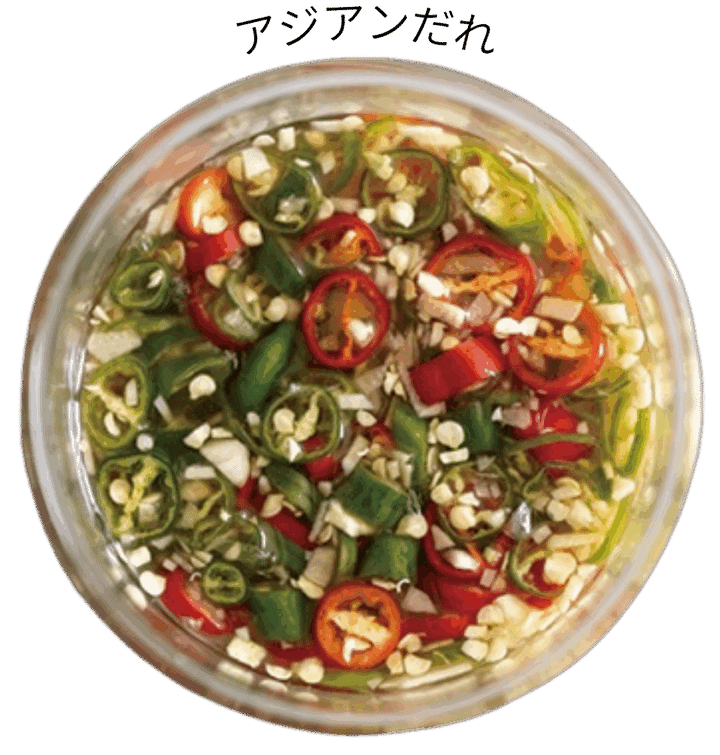 “アジアンだれ”は、鶏肉のグリル焼き、豚しゃぶしゃぶ肉と豆腐のサラダとも好相性!