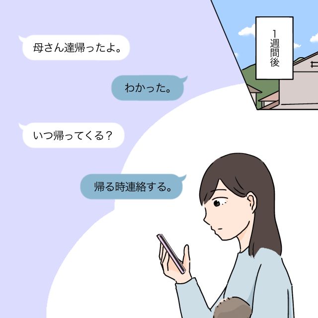 タケルからの電話に出たお母さんは、「お父さんの具合が悪いからモエに来てもらった」と話を作り、私がすぐに帰らなくてもいいようにしてくれました。タケルは一旦すごすごと引き下がるも、義母に言われたことをまんまメッセージで伝えてきてうんざりしてしまいました。