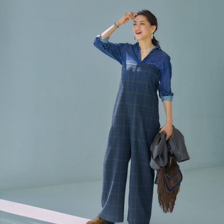 流行りのジャンプスーツをシックなチェック柄で大人仕様に