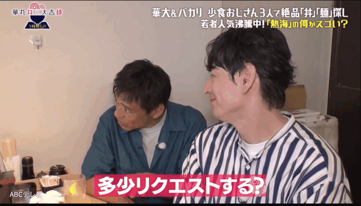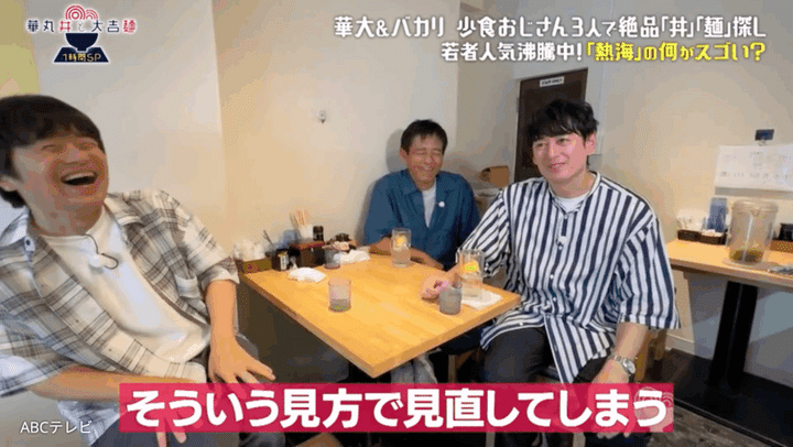 少食おじさんの博多華丸・大吉が、ただただ食べたい丼か麺を探し求める街ブラ番組『華丸丼と大吉麺』(ABCテレビ)。番組初となる男性ゲスト、バカリズムを迎えての1時間スペシャルが放送された。熱海で巨大な「焼きカツ丼」を待ちながら、天才脚本家・バカリズムが語った、ドラマ制作にまつわる裏話とは…!?