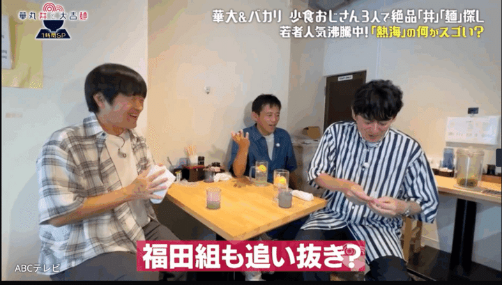「ちょっと僕、福田組さんはわからないんですけど(笑)」と困ったように笑う大吉に、「でも、5(本の指に)は入るね」と言い直す華丸。「3(のまま)でいいじゃん(笑)。なんで(増やすの)? 私、3(本指を前提)で話してるのに(笑)」と異議を唱える大吉に、「ギクシャクしたら嫌やもん」と華丸。自分が「福田組」などと言い出さなければギクシャクしなかったのに、さらには「7くらいにする? 神セブン(笑)」とお茶をにごす。