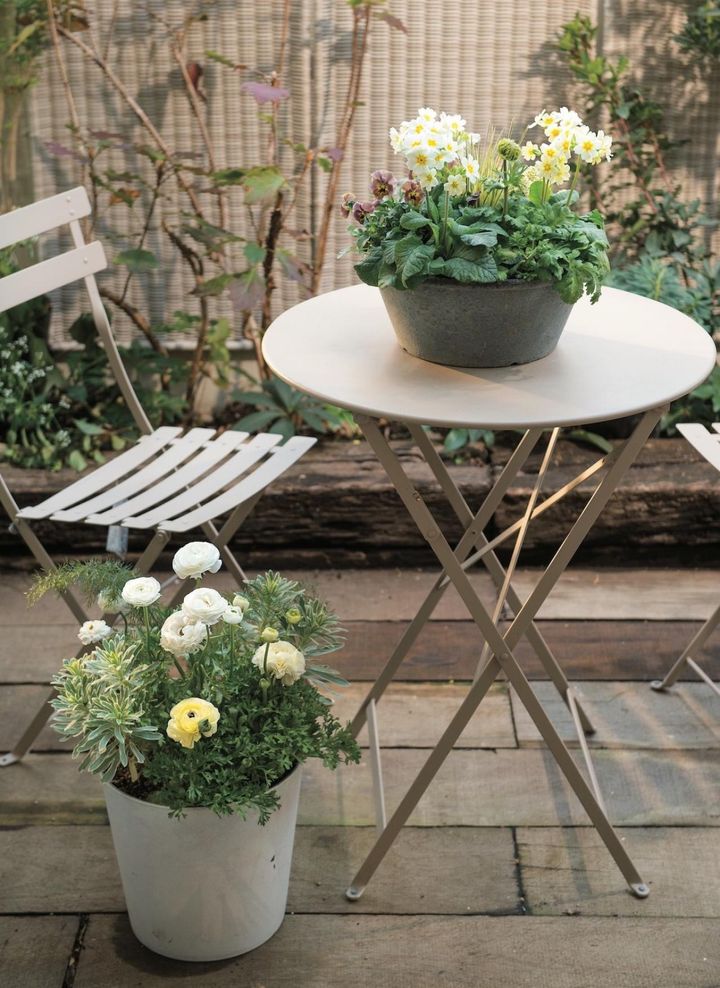 テーブルの上には、定番の浅鉢を。光色(白系)と陰色(紫系)の花色の組み合わせ。いずれも高さ20cm程度にしか伸びないアネモネ、プリムラ、ビオラを寄せ植え。