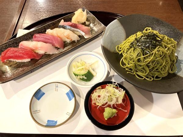迷った末に茶そばセットから、「すしそば(すし5貫+茶そば)」¥1,500 にしました。