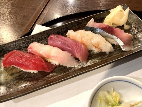 すしはサバ、赤海老、カツオ、鯛、マグロ。シャリが細長く握ってあり食べやすく、ネタはどれも新鮮で美味しい!