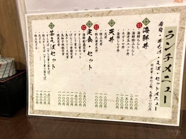 定番のランチメニューは、「げんこつ唐揚げ定食」¥1,100 や「海鮮ちらし」¥1,200、」すし7貫セット」¥1,500