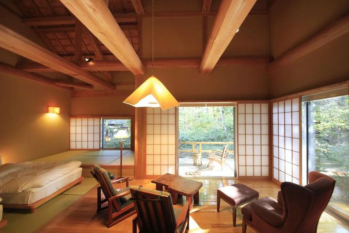 「BOSCAGE Kariya」が位置する湯河原は、温泉と自然の美しさが融合した癒しの地。どの客室にも温泉露天風呂があり、美しい自然の借景を眺められ、中には「紅葉」と名付けられたお部屋もある。夜には敷地内の森がライトアップされ、闇の中に浮かび上がり、昼間の美しさとは違う紅葉の姿に、また新しい発見があるかもしれない。