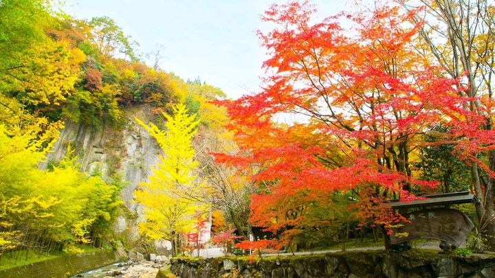 黒川温泉を流れる渓流沿いに建つ「黒川温泉 黒川荘」は、古民家を移築した重厚な雰囲気。記念日や大切な人との旅行といったスペシャルな時間を過ごしたいときに選ぶ人も多い。目の前にそびえる屏風岩は、大自然が作った芸術品。秋は屏風岩と色とりどりに色づく紅葉の共演を楽しめる。宿の温泉ももちろんだが、黒川温泉の入湯手形を利用すれば25施設の露天風呂をめぐることも可能。黒川温泉街をそぞろ歩いて、自分だけの秋の風景を探してみて。