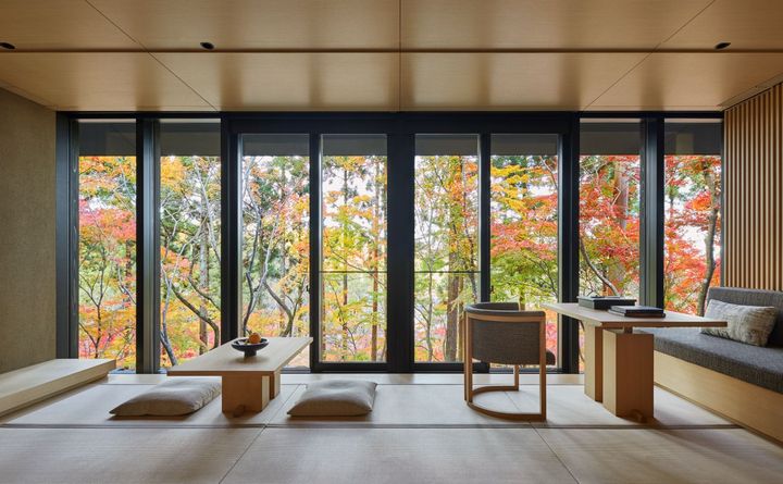 京都洛北にたたずむ「アマン京都」は、京都駅から車でわずか 30 分の距離には思えないほど静かな森に囲まれた空間。客室の壁一面の窓からは庭の景観を、高台のパビリオンからは楓や杉などの木々や近郊の山々の紅葉を鑑賞できる。檜の温泉は疲労回復や筋肉痛の改善、美肌効果もあると言われているアルカリ性単純泉。仏教の沐浴から広まり、6世紀にまで遡る日本の風呂文化に思いを馳せてみるのもいい。初夏には鮮やかな青もみじ、秋には美しい紅葉に包まれる、その静謐な世界観に没入したい。