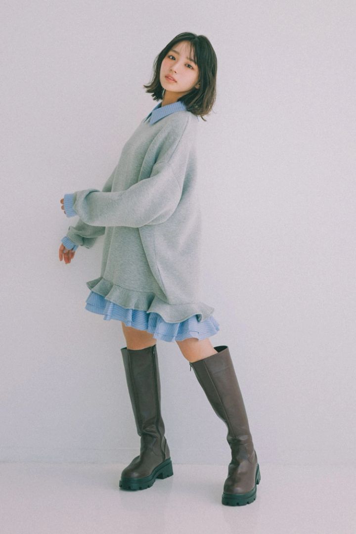 シャツレイヤードワンピース 11,300円/Olu. ロングブーツ 4,290円/神戸レタス