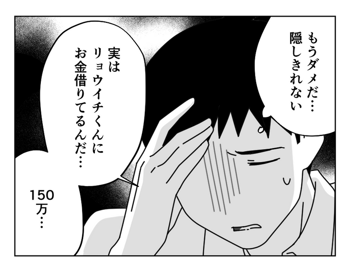 とうとう隠し切れなくなったケイシさん、エリナさんにすべてを打ち明けました。どれだけ罵倒されても、自分が悪いのだから耐えよう……とぐっと身構えているようです。借金の事実を隠して結婚したのだから、「そんなウソをつくような人とはやっていけない」と言われる可能性もありますよね。こんなことなら、最初から正直に伝えておけばよかった話。ケイシさんは後悔でいっぱいの様子です。