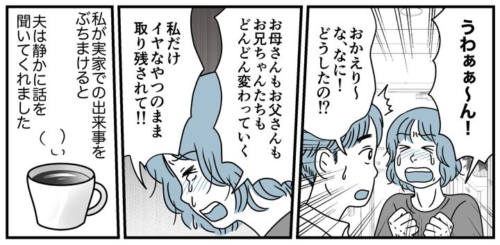 私に頭を下げる父と、涙ながらに謝る母。その姿もなんだか悔しくて、私はそのまま実家を飛び出しました。酔っぱらって大泣きする私を、自宅で出迎えてくれた夫。穏やかに話を聞いてくれたので、私もようやく落ち着くことができました。
