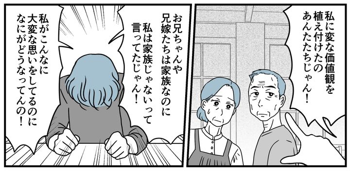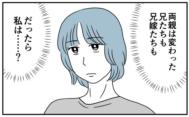 私はアイ(28)。結婚して夫と2人暮らしです。私の父は男尊女卑のくそジジイ。母はそんな父の言いなりになる弱い人。そんな両親に育てられた、時代錯誤の長兄ハジメと次兄ケイゴ……。けれどその価値観に従ったまま変われなかった私のことを、兄嫁のマリカさんは「あなたこそバカ」だと言い放ちました。年老いた両親はすっかり変わり、以前の主従関係などなかったかのように助け合っています。私はそれを見て我慢できずに感情をぶちまけました。