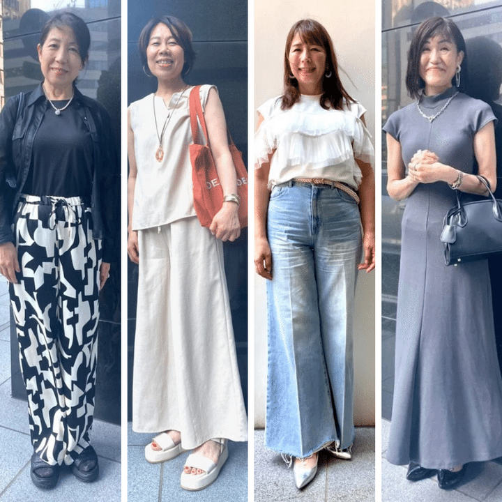 【60代お手本スナップ】ベーシックカラーでも地味にならない着こなしにするには?小物や柄、フォルムで大人の華やかスタイリング4選