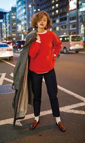 「秋冬のデニムスタイルの1つに加えたいのが、濃紺のデニムパンツにロンTや靴下を挟み、肌を見せずにキレイめに仕上げること。派手色ニットもロンTを1枚中に入れて、白を効かせるだけで着やすくなります。肌が見える部分を少量の白で覆うのがポイント」(樋口さん)