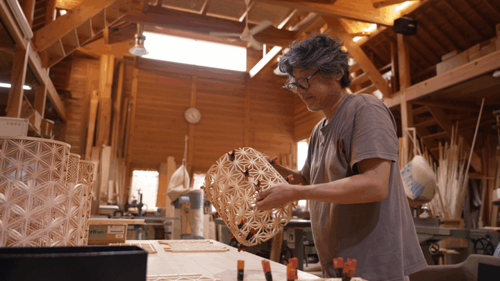 釘や金具を使わずに、細い木を幾何学的な文様に組み合わせる「組子」は、およそ1400年もの歴史を持つと伝わる日本の伝統的な木工技術です。そんな平面構造が当たり前の組子の常識を打ち破り、新たな技法「立体組子」を生み出したのが、「村山木工」の木工職人、村山伸一さん。世の中に存在していなかった唯一無二の技法を創り出しました。