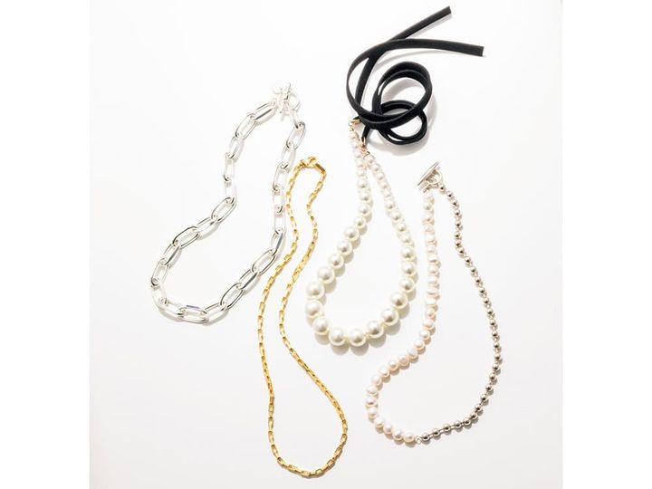 右から/ボールチェーンとのコンビネーションでパールもかしこまりすぎず、普段使いしやすい。ネックレス¥60,500(ラムダ)黒やネイビーの無地Tに品よく映えるパールチョーカー。スエードリボンで長さ調整できるのも便利。ネックレス¥8,800(シー/エスストア)重ねづけにも効果的なシンプルなロングチェーン。ネックレス〈ゴールド〉¥19,800一点投入でエッジの効いた胸元に。〈シルバー〉¥18,700(ともにワンエーアールバイウノアエレ/ウノアエレ ジャパン)