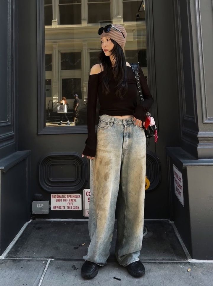 「ルーズなデニムが好きでよくはくのですが、カジュアル過ぎないようにブラックのレザースニーカーを合わせるのが最近のブーム。スタイリングにヌケ感が出るよう、ほんのり肌見せをして女性らしさを取り入れたのがポイントです」