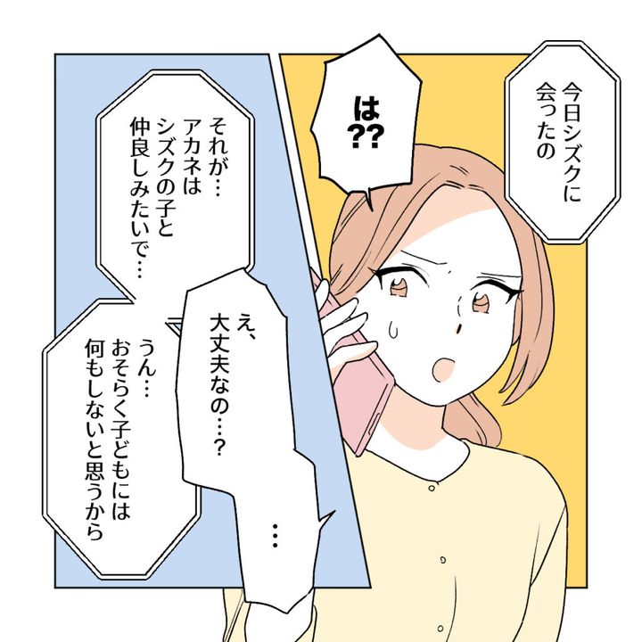 カエデは、娘のアカネにシズクの娘ミズキのことを聞いてみました。「アカネはさ、ミズキちゃんと仲いいの?」するとアカネは「ミズキちゃんはみんなと仲良いかな。1人でいるといつも仲間に入れてくれるんだ」と元気に答えました。「そっか。ミズキちゃん優しいね。」アカネの様子から少し安心したカエデです。