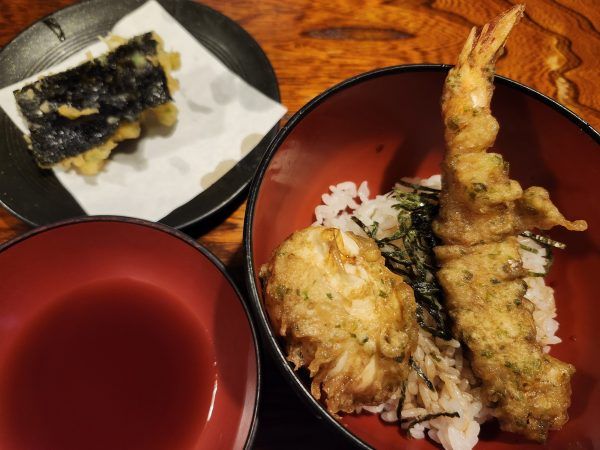 「さぬきうどん○讃」はうどんだけではなく、天ぷらや天丼もオススメです。「のり天ぷら」(110円)と「ミニ海老玉子天丼」(508円)も注文。天ぷらは少量で頼めるのも嬉しいですね。