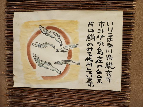 壁には「いりこは香川県産観音寺市沖伊吹島産の白口系片口鰯のみを使用しています」と表示があり、食材へのこだわりがうかがえます。