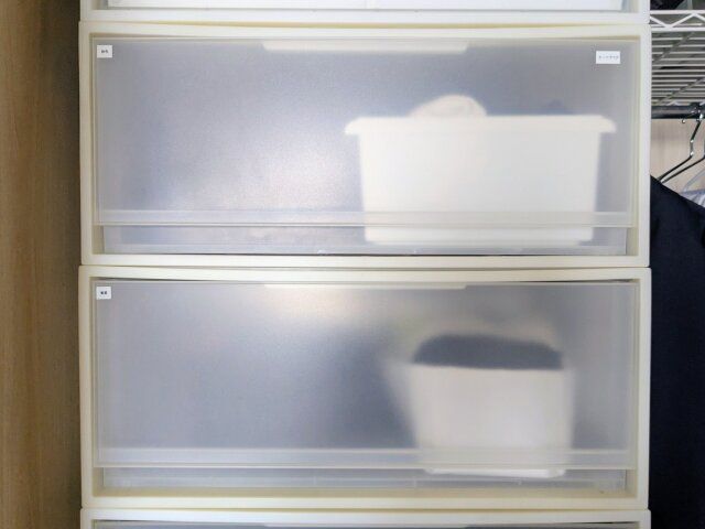 引出しは、無印良品の「ポリプロピレン 収納ケース ワイド」に統一し、春夏用と秋冬用をそれぞれ別の収納ケースに収納。衣替えは引出しを入れ替えるだけで完了します。