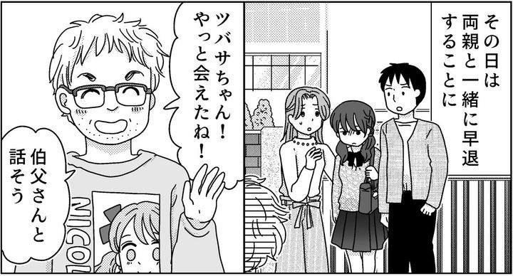 両親が先生と話をした結果、この日は両親と一緒に早退することになりました。両親と3人で学校を出ると、そこには伯父が立っていました。最初は怖さが勝っていたものの、ニヤニヤしながらしゃべる伯父さんを見ていたらだんだんと腹が立ってきました。
