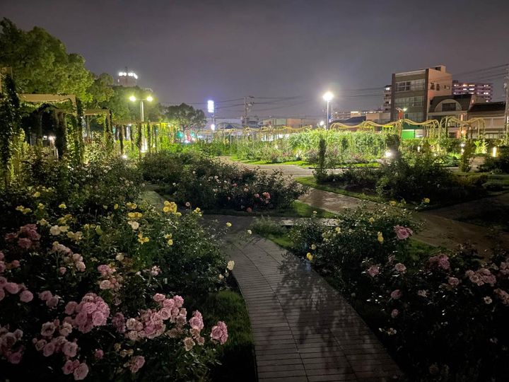 ライトアップされた夜の幻想的なばら公園。昼とはまた違う秋バラの雰囲気を味わえる。園内各所の大小のアーチがバラの立体感を演出。