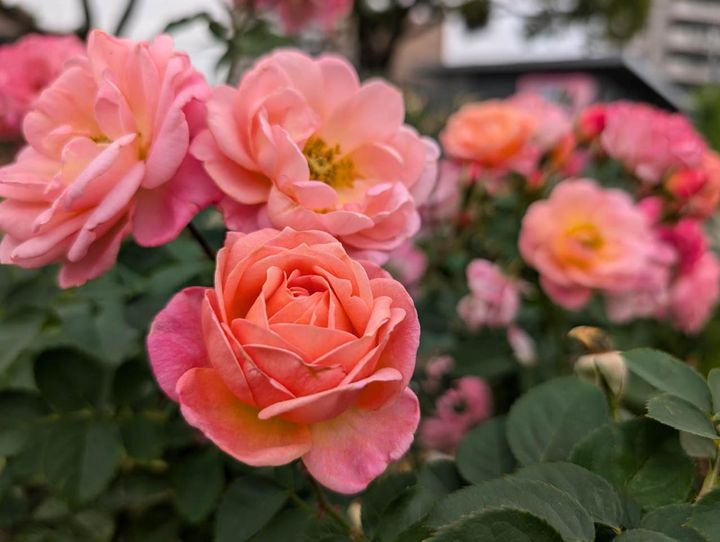 フランスのデルバール社が作出した、オレンジピンクからピンク、淡いピンクへと花色が変化するかわいらしい人気品種。