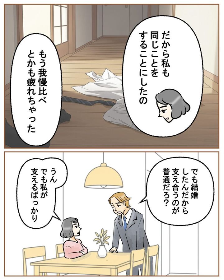 「だから私も同じことをすることにしたの。もう我慢比べとかも疲れちゃった」と打ち明けると、「でも結婚したんだから支え合うのが普通だろ?」ツカサにそう言われ、「うん。でも私が支えるばっかり」
