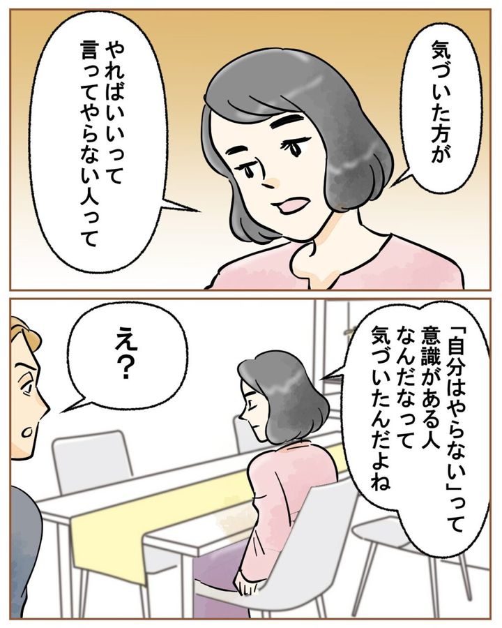 「『気づいた方がやればいい』って言ってやらない人って、『自分はやらない』って意識がある人なんだなって気づいたんだよね」私がそう言うと、「え?」と不思議そうなツカサに、