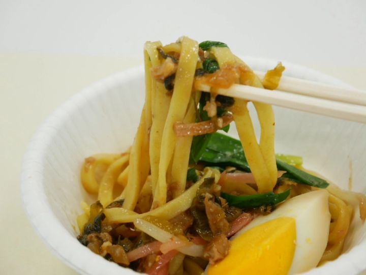 現地の定番料理「意麺(イーメン・小麦粉と卵から作られた平打ちのちぢれ麺)」を成城石井らしくアレンジしています。麺は本場の味わいを再現するため、現地にならって小麦粉と卵を使用した平打ち麺をわざわざ開発したのだとか。