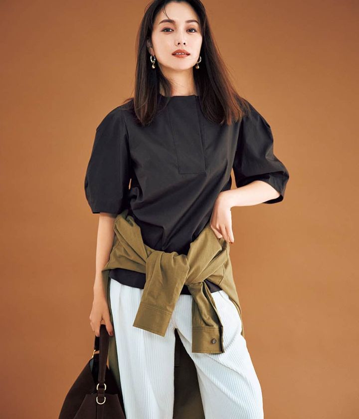 大好きな袖盛り甘ブラウスもブラウンにシフトすれば、グッと新鮮で色っぽく。