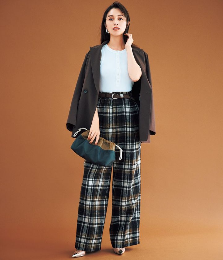 ブラウス¥64,900(ドゥロワー/ドゥロワー 青山店)パンツ¥51,700(6397/エスアンドティ)腰に巻いたジャケット¥44,000(ヴェニット/ハルミ ショールーム)バッグ¥183,700(ザンケッティ/ショールーム ロイト)ピアス¥119,900(アグメス/ショールーム ロイト)