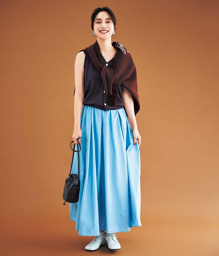 ノースリトップスをブラウン×ニットにシフトするだけでグンと秋らしさが。グレイッシュなペールブルーとの柔らかトーンの掛け合いで好感度と華やかさを両得。