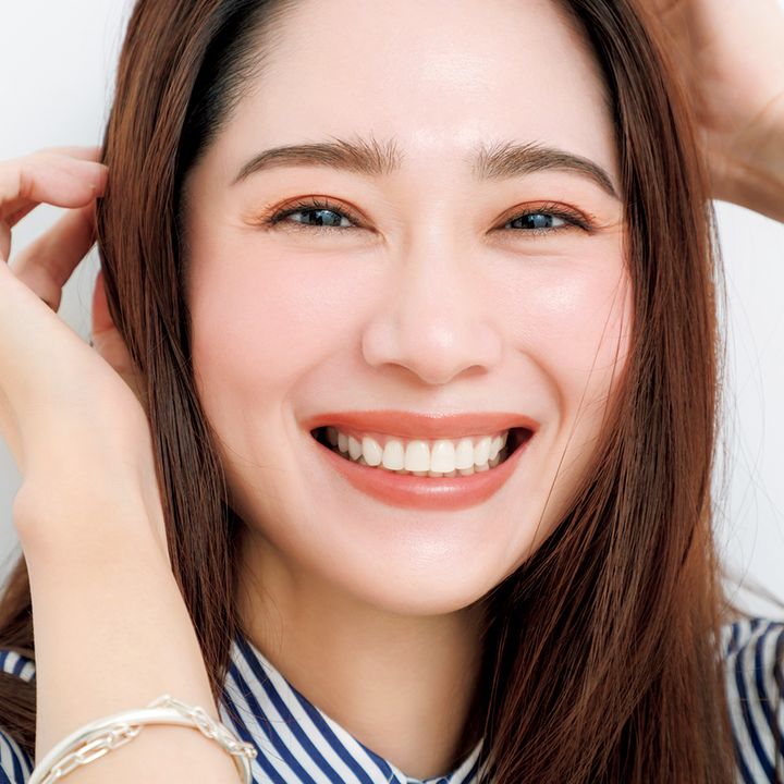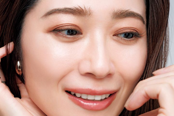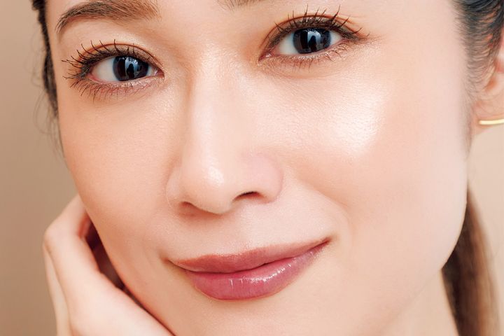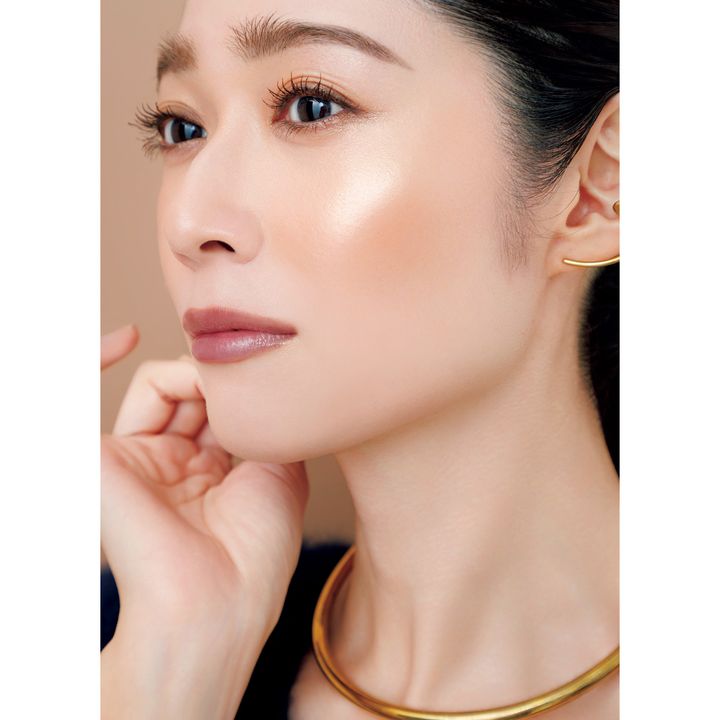 ブラウンシャドウが主役のメイクは、クリームファンデーションで端整な肌に整えておくと品よく仕上がる。ハイライトチークでみずみずしさを。リップはブラウンと好相性の艶やかなコーラル。